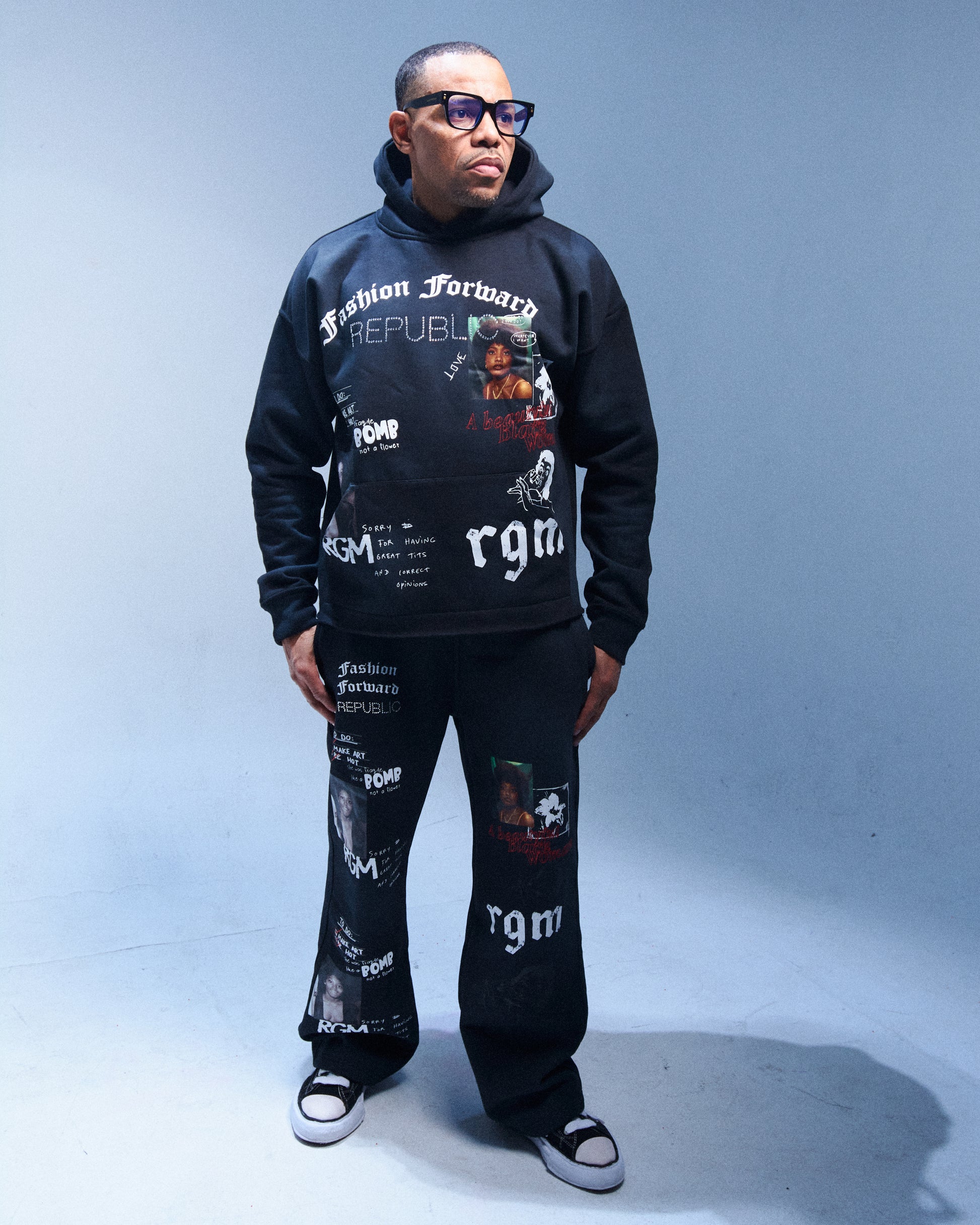 Featuring a cropped, distressed hoodie paired with matching pants, this look is elevated by a rhinestone emblem that adds a subtle flash of edge. Custom graphics hit both the front and back of the hoodie, with coordinating artwork on the front of the pants for a cohesive, high-impact finish.
